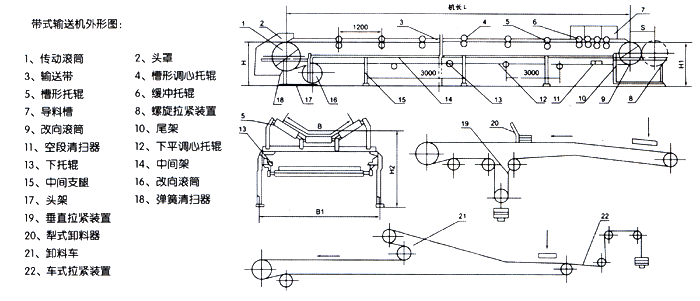電氣保護可設有:輸送帶跑偏監測器;輸送帶打滑監測器;輸送帶縱向撕裂信號監測器;料位控制監測器等。帶式輸送機外形圖